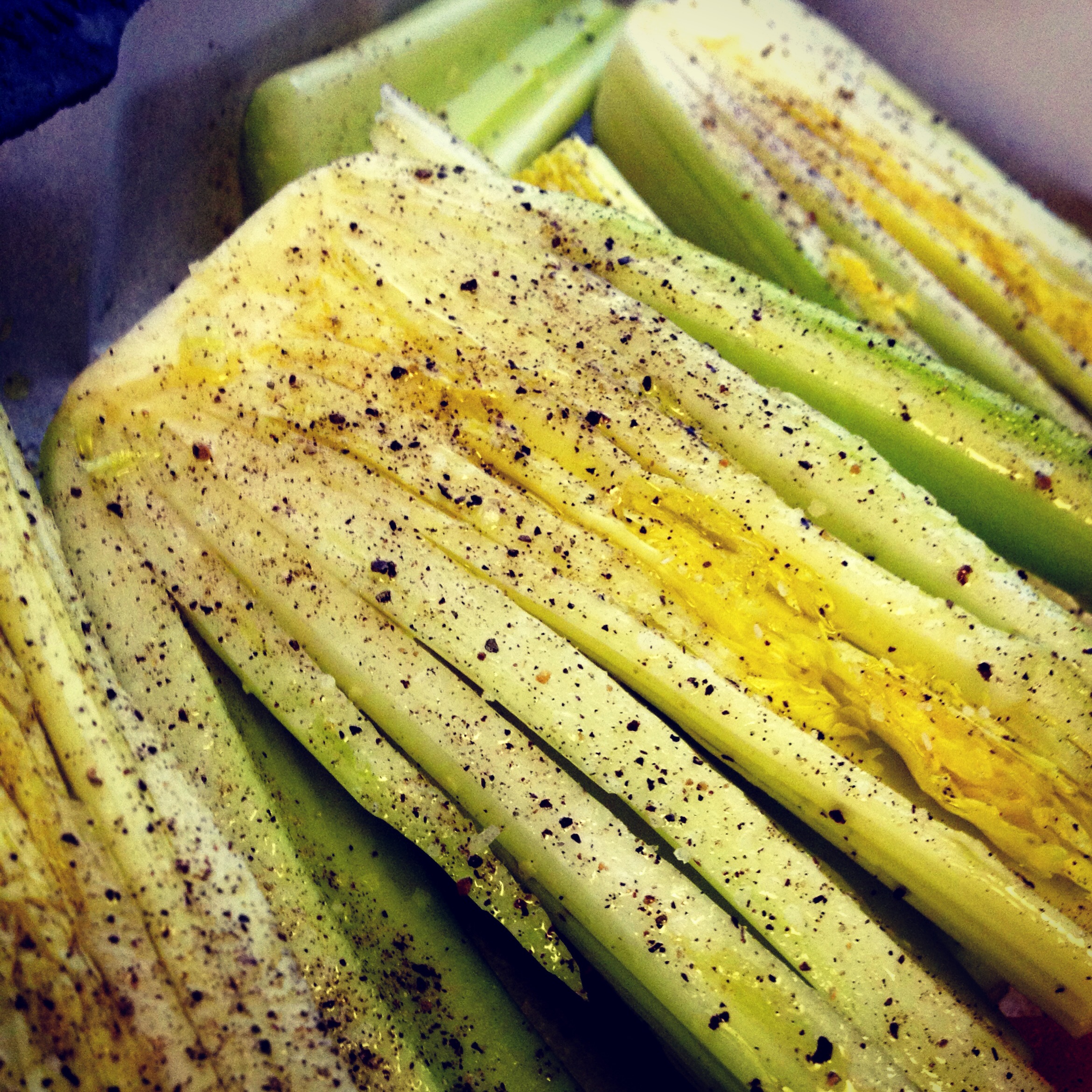 Quarter your celery root bits and toss with olive oil. Sprinkle with a pinch of salt and a liberal amount of pepper. Roast at 425 for 45 minutes.