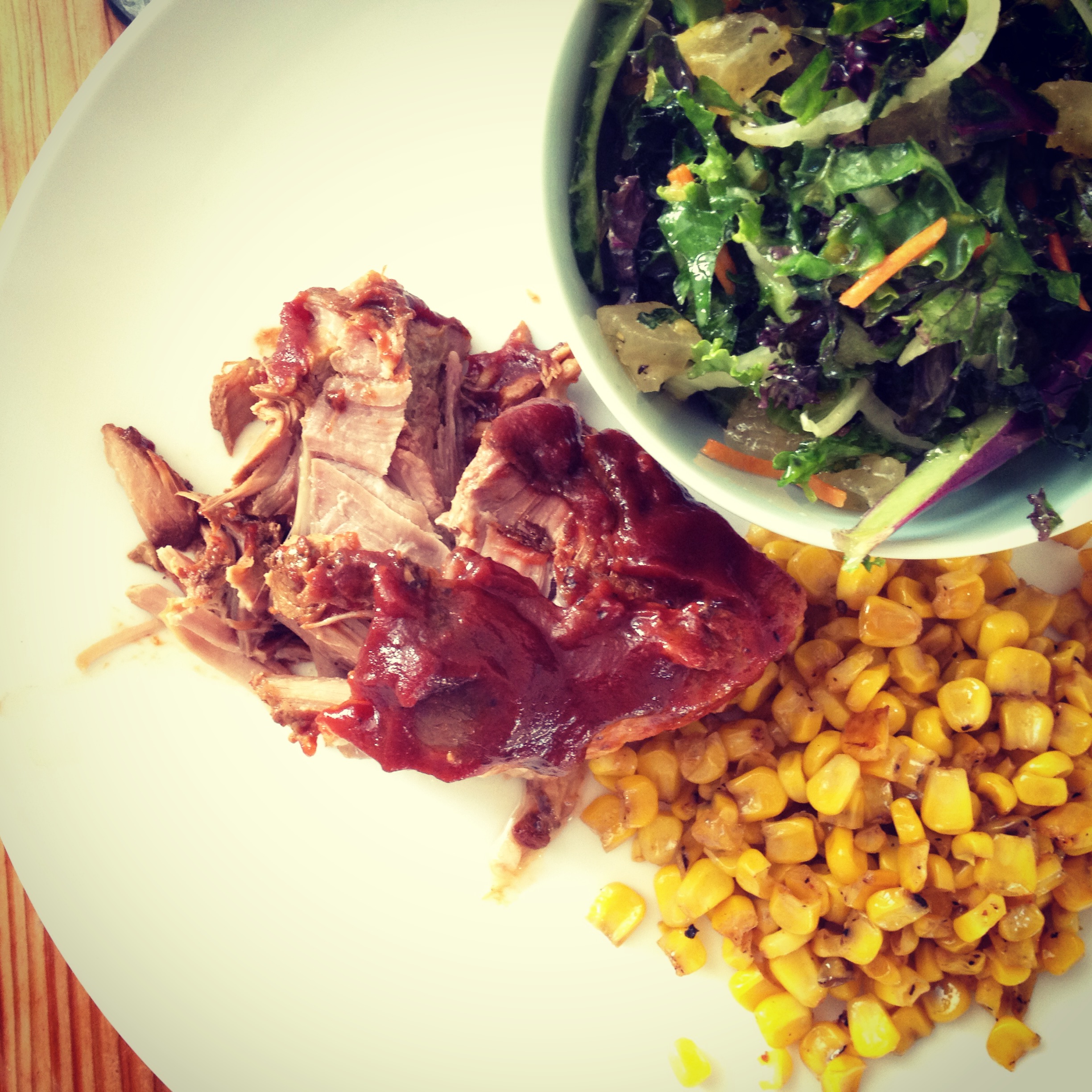 Final product: the most mouth watering meat I’ve ever home-cooked, and two perfectly complimentary sides. Needless to say, this could easily satisfy any BBQ craving without [most of] the guilt.